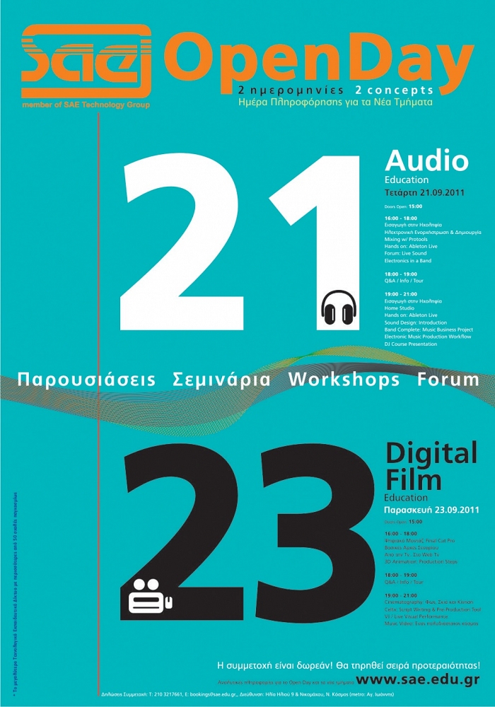 Η SAE Athens σας προσκαλεί την Τετάρτη 21 και την Παρασκευή 23 Σεπτεμβρίου από τις 16.00 έως τις 21.00, στο Open Day, τον καθιερωμένο θεσμό πληροφόρησης εν όψει της νέας ακαδημαϊκής χρονιάς. Οι συμμετέχοντες έχουν τη δυνατότητα να παρακολουθήσουν δωρεάν σεμινάρια, workshops και παρουσιάσεις πάνω στις θεματικές του Audio Engineering & Production και του Digital Film Making - που ξεκινάει για πρώτη φορά στην Ελλάδα -, παίρνοντας μία γεύση από τα πρωτοποριακά προγράμματα της SAE, ενώ παράλληλα μπορούν να γνωρίσουν τους εισηγητές και να ξεναγηθούν στις εγκαταστάσεις της σχολής.
